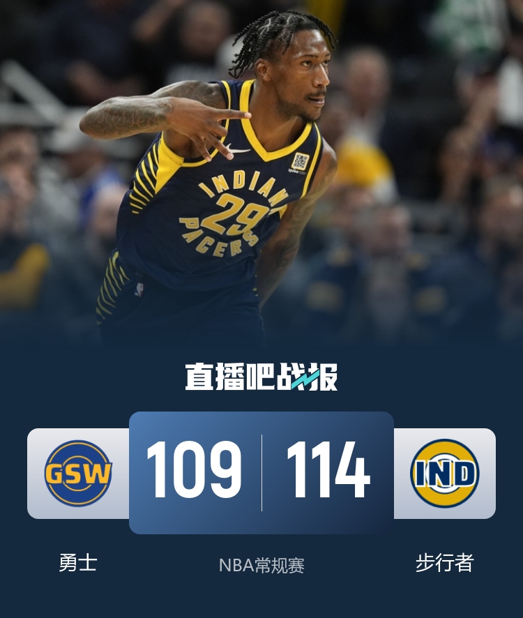 11月2日讯 NBA常规赛,步行者今日迎战勇士,前者开季已经遭遇五连败未尝胜绩,后者上场比赛则是输给雄鹿。