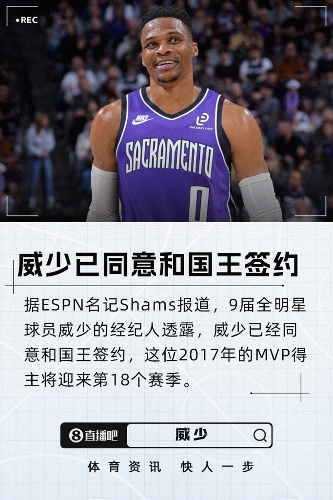 突发新闻:9届全明星球员威少的经纪人&Excel Sports Management的Jeff Schwartz向ESPN透露,威少已经同意和国王签约,这位2017年的MVP得主即将迎来他的第18个NBA赛季;